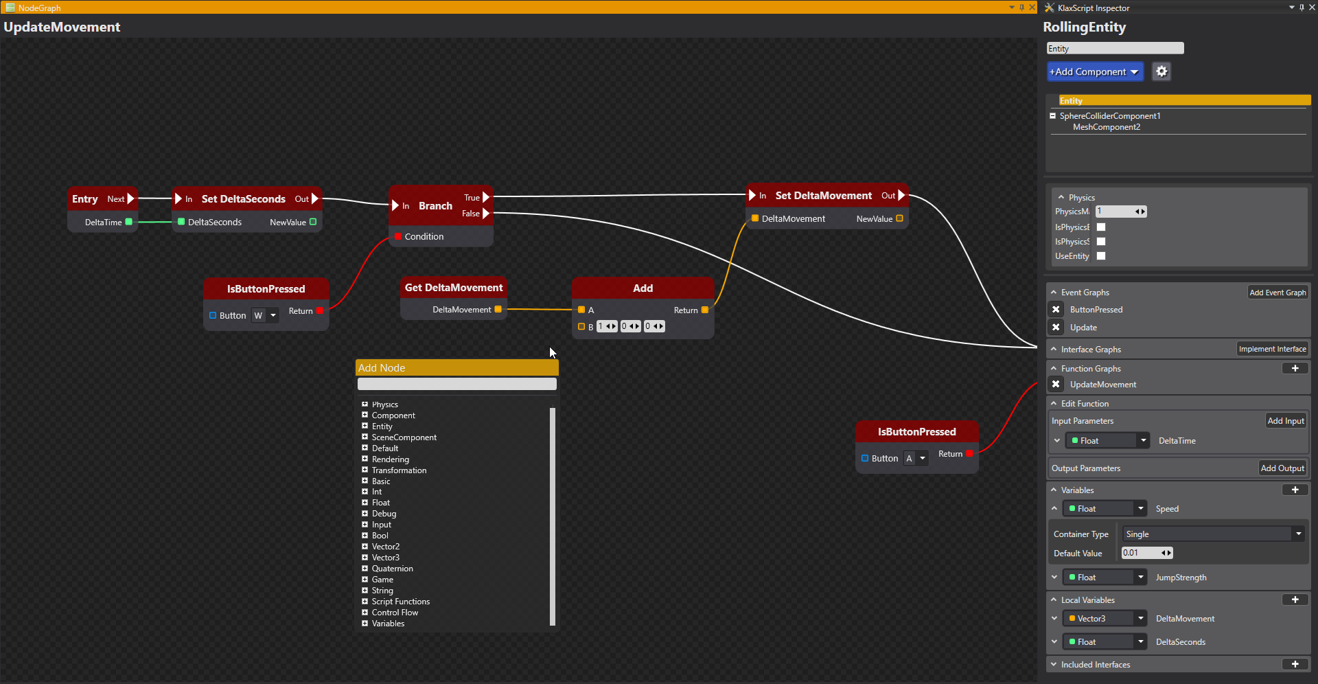 The most polished part of the engine was our own visual scripting system called KlaxScript. It was heavily inspired by Unreal Engine's Blueprints and Crytek's counterpart Schematyc. It allows the creation of game logic without recompilation and is entirely data-driven. The included features are: